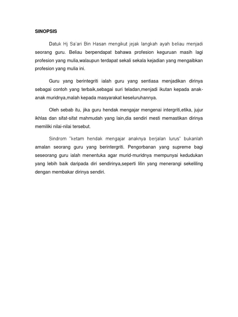 Sinopsis adalah ringkasan suatu karangan yang menggambarkan keseluruhan isi karangan sekaligus menjadi pengantar atau pengiring dari karangan tersebut.